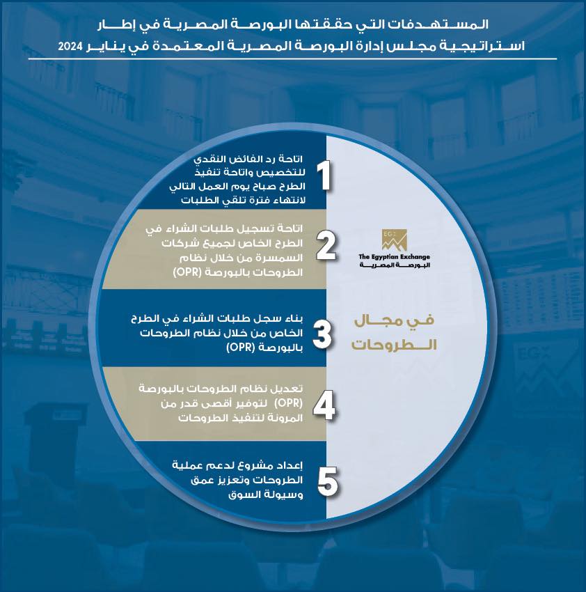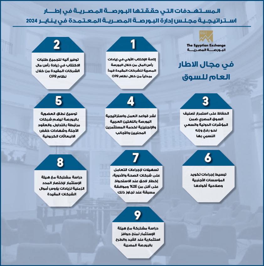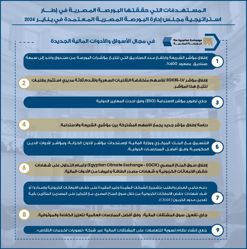 7 إنجازات تحققها البورصة المصرية ضمن استراتيجيتها المعتمدة في يناير 2024 (إنفوجراف)
