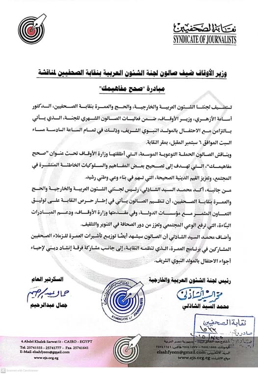 وزير الأوقاف ضيف صالون لجنة الشئون العربية بنقابة الصحفيين لمناقشة مبادرة "صحح مفاهيمك"