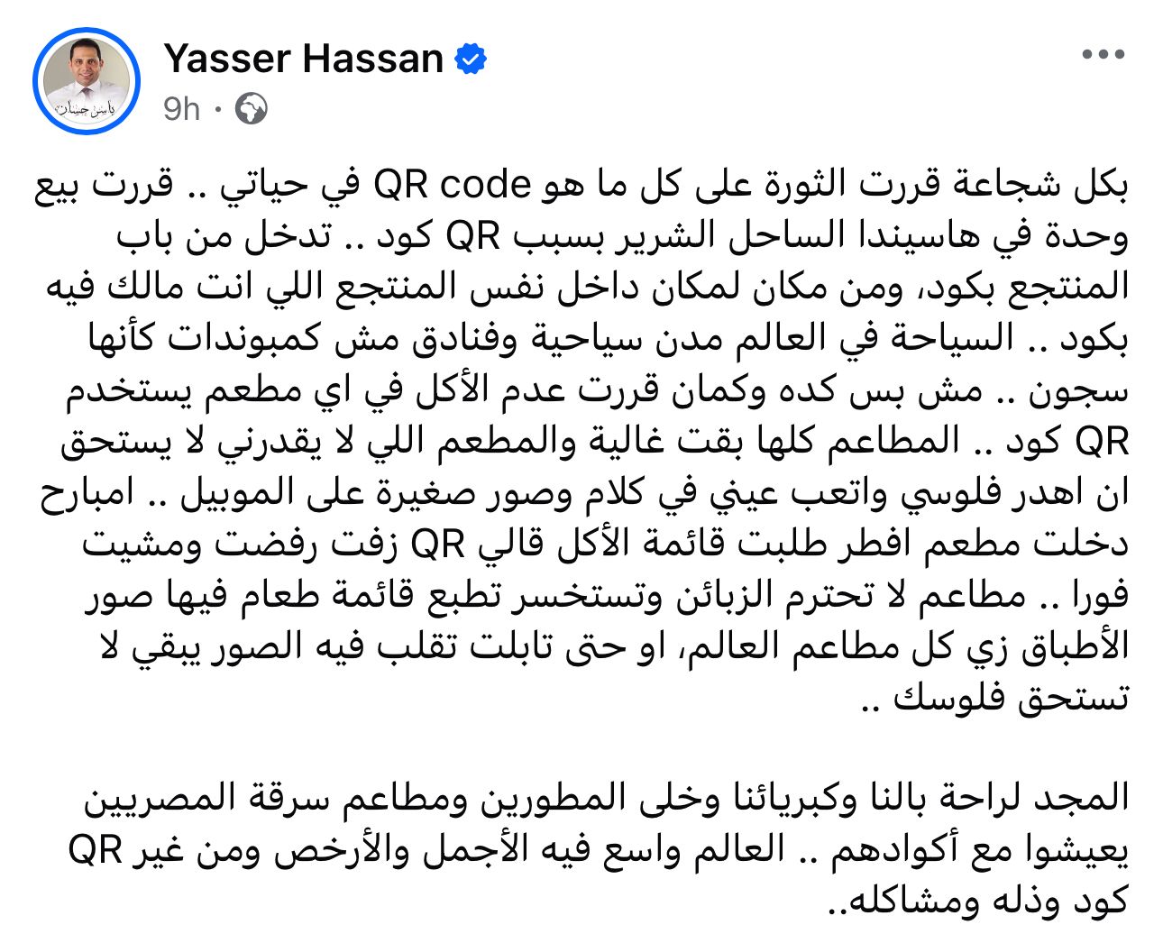 واستطرد،" المجد لراحة بالنا وكبريائنا وخلى المطورين ومطاعم سرقة المصريين يعيشوا مع أكوادهم .. العالم واسع فيه الأجمل والأرخص ومن غير QR كود وذله ومشاكله".