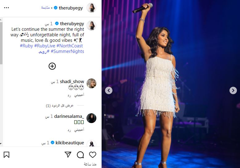 شاركت الفنانة روبي جمهورها ومتابعيها لقطات من حفلها الأخير الذي أحيته بالساحل الشمالي وسط حضور جماهيري كبير وعبرت روبي عن سعادتها بنجاح حفلها قائلة " دعونا نواصل الصيف بالطريقة الصحيحة ليلة لا تُنسى، مليئة بالموسيقى والحب والأجواء الجيدة".