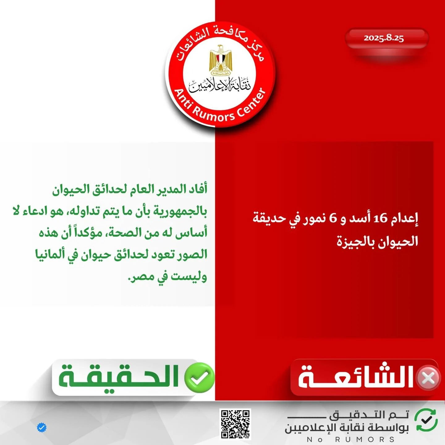 نفى مركز مكافحة الشائعات التابع لنقابة الإعلاميين برئاسة النائب الدكتور طارق سعده، نقيب الإعلاميين وعضو مجلس الشيوخ، ما تداوله بعض رواد مواقع التواصل الاجتماعي حول إعدام 16 أسد و 6 نمور في حديقة الحيوان بالجيزة.
