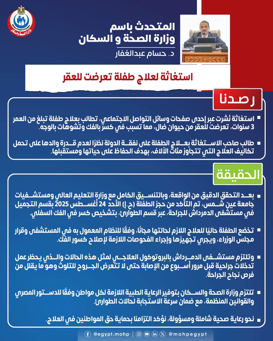 متحدث الصحة عن استغاثة لعلاج طفلة تعرضت للعقر: تعالج بالمجان في الدمرداش