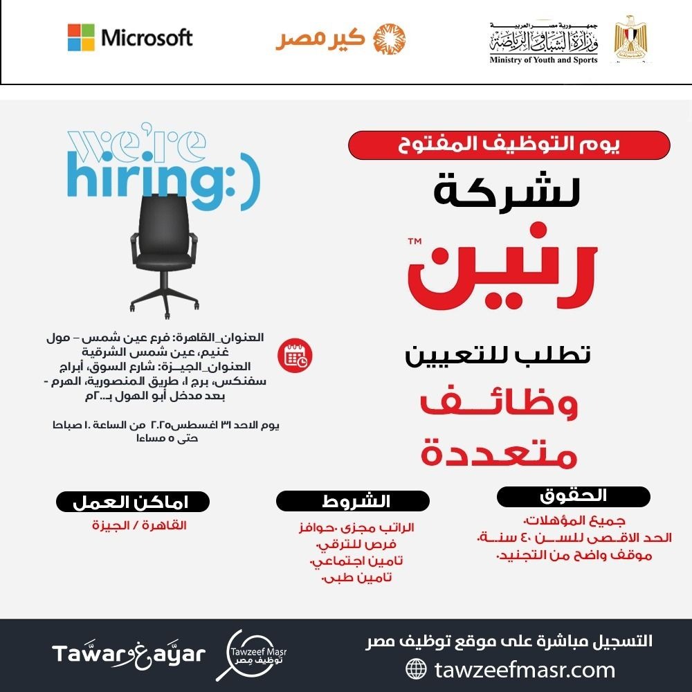 للمزيد من الوظائف يرجى زيارة موقع توظيف مصر:tawzeefmasr