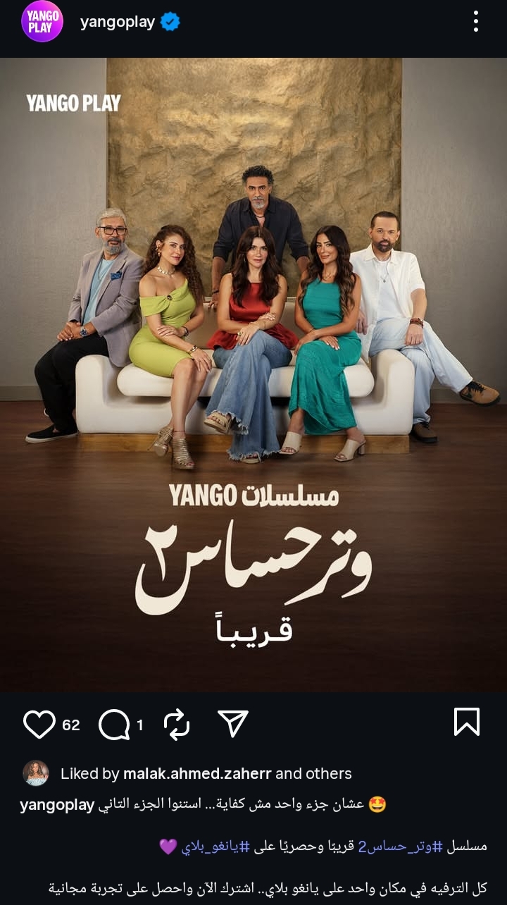 أضافت:" مسلسل وتر حساس 2 قريبًا وحصريًا على يانجو بلاي".