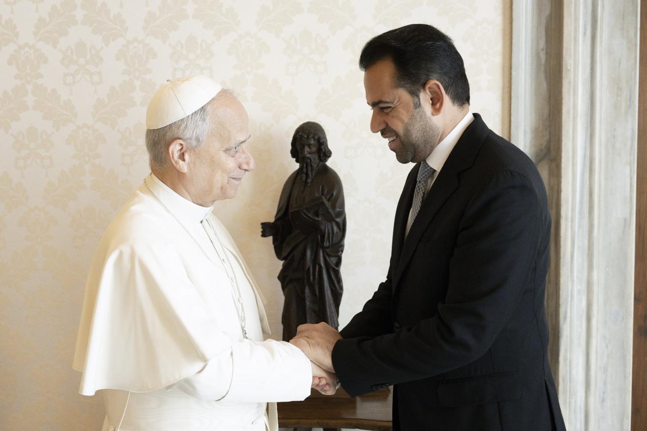 استقبل قداسة البابا لاوُن الرابع عشر، بابا الكنيسة الكاثوليكيَّة، في القصر البابوي بحاضرة الفاتيكان، سعادة المستشار محمد عبد السلام؛ حيث أعرب البابا عن تقديره لفضيلة الإمام الأكبر أ.د أحمد الطيب، شيخ الأزهر الشريف رئيس مجلس حكماء المسلمين، مؤكدًا الدَّور المحوري للحوار بين الأديان في تعزيز السَّلام والأخوَّة الإنسانية عالميًّا، ومن أجل وقف ما يشهده عالمنا اليوم من أزماتٍ ونزاعاتٍ وحروبٍ.