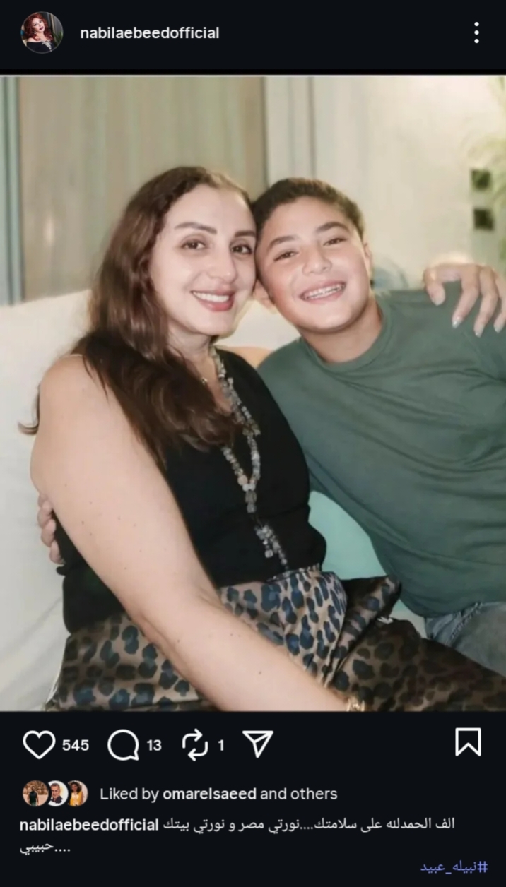 ونشرت نبيلة عبيد صورة لـ أنغام برفقة نجلها بعد عودتها في منزلها بالساحل الشمالي، من خلال حسابها الرسمي عبر موقع تبادل الصور والفيديوهات القصيرة "إنستجرام"، وكتبت: "ألف حمدلله على سلامتك.. نورتي مصر ونورتي بيتك حبيبي".