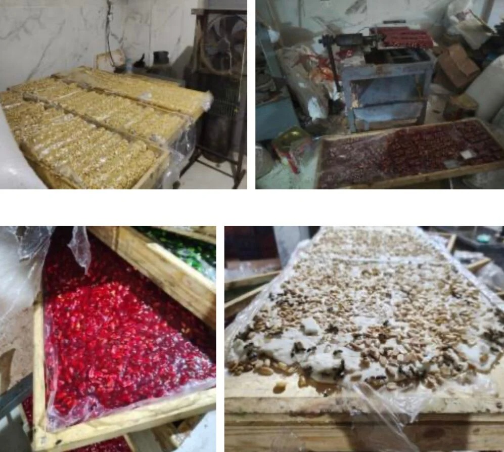 وعُثر بداخل المصنع على 4 طن حلوى المولد مختلفة الأحجام "تحت التجهيز، منتج نهائى" مدون عليه علامات تجارية وهمية – أكثر من 4 طن خامات مستخدمة فى التصنيع مجهولة المصدر - الأدوات المستخدمة فى التصنيع)، وتم إتخاذ الإجراءات القانونية.