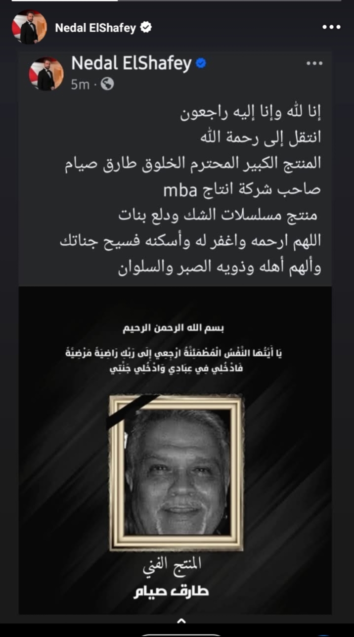 وكتب نضال الشافعي من خلال حسابه الرسمي عبر موقع التواصل الاجتماعي "فيسبوك"، عبر خاصية ستوري، قال: "إنا لله وإنا إليه راجعون، انتقل إلى رحمة الله المنتج الكبير المحترم الخلوق طارق صيام، صاحب شركة انتاج mba منتج مسلسلات الشك ودلع بنات".