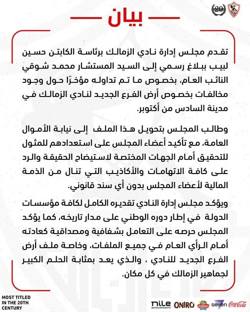 تقدم مجلس إدارة نادي الزمالك برئاسة الكابتن حسين لبيب ببلاغ رسمي إلى السيد المستشار محمد شوقي النائب العام، بخصوص ما تم تداوله مؤخرًا حول وجود مخالفات بخصوص أرض الفرع الجديد لنادي الزمالك في مدينة السادس من أكتوبر.