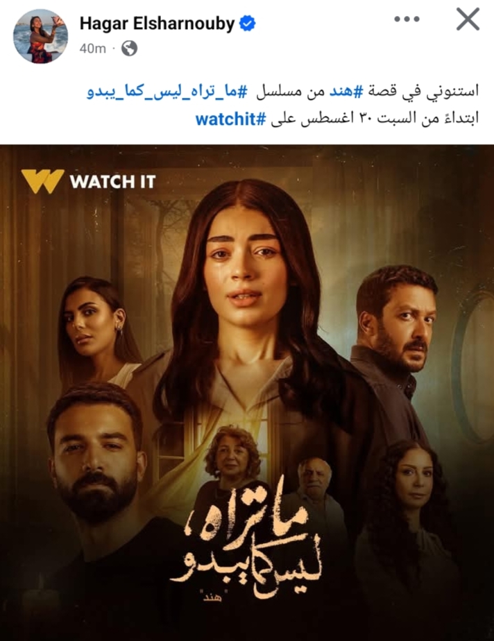 روجت هاجر الشرنوبي لـ دورها في حكاية هند بطولة ليلى أحمد زاهر من مسلسل ماتراه ليس كما يبدو، والذي من المقرر طرحه حصريًا على منصة Watch it ومنصة شاهد بدءً من يوم السبت المقبل الموافق 30 أغسطس الشهر الجاري.