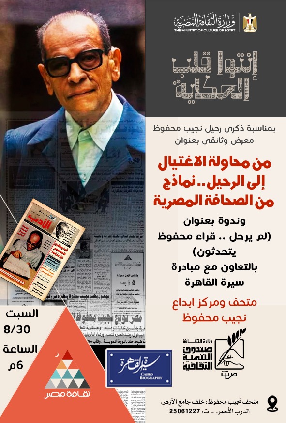 بمناسبة الذكرى الـ19 لرحيل الأديب العالمى نجيب محفوظ (1911-2006)، يقيم متحف ومركز إبداع نجيب محفوظ، بتكية محمد أبو الدهب، التابع لقطاع صندوق التنمية الثقافية ، برئاسة المعمارى حمدى السطوحى، فى السادسة من مساء السبت القادم (30 أغسطس)، وهو ذات يوم الرحيل؛ ثلاث فعاليات دفعة واحدة.