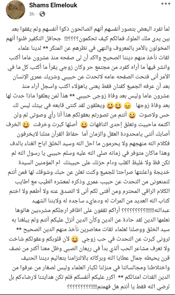 أضافت:" أنتم من تصورتم بعقولكم هذآ أنا رأي وصوتى لم ولن اكتمه ماحييت وتعلق إحدى التافهات أصلها كبرت وخرفت الخرف أصابك أنتى يامحدودة العقل والزمان أما حفاظ القرآن مثلنا لايخرفون فكلام الله منهجهم ولا يحرمون ما احل الله وسيد الخلق اباح الغناء بالدف وهذا ماكان متوفر في زمانه صلي الله عليه وسلم حبيبي يا رسول الله لم تكن فظ ولا غليظ القلب ودام حزنك على حبيبتك ام المؤمنين السيدة خديجة واعلنتها صراحتا للجميع وكنت تعلن عن حبك وشوقك لها فمن أنتم لتمنعونى من التحدث عن حبيب عمرى وذكره لمعشره الطيب مع اطايب الكلام الراقي المحترم ومن أفتى لكم أنى لا اتصدق عنه ولا أطعم ولا اختم كتاب الله العديد من المرات له ودعايء ساجده له ولابننا الشهيد عبدالله!!!!!!!؟؟".