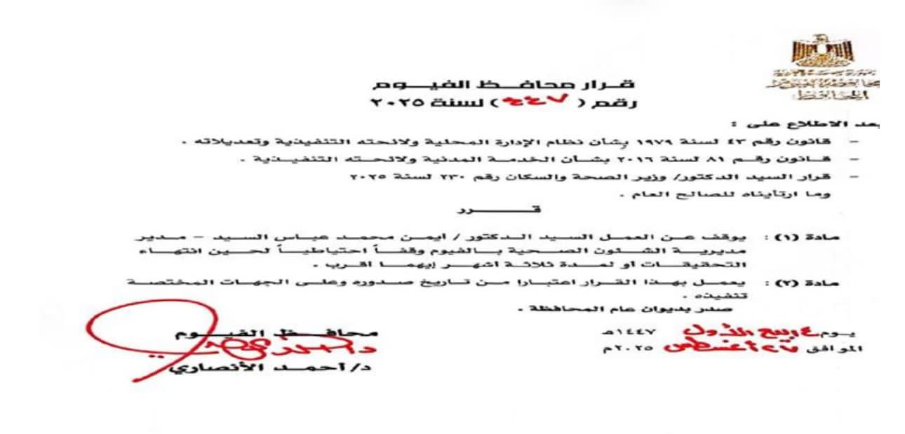 وكان قد أصدر الدكتور أحمد الأنصاري محافظ الفيوم، قرارًا مفاجئًا بإقالة الدكتور أيمن محمد عباس السيد، وكيل وزارة الصحة والسكان بمحافظة الفيوم، وقفًا احتياطيًا لحين انتهاء التحقيقات أو لمدة 3 أشهر أيهما أقرب، لعدم التزامه بالإجراءات الإدارية المنظمة للعمل، وذلك بعد مرور 27 يومًا فقط على تعيينه في هذا المنصب، والذي جاء مطلع أغسطس الجاري.