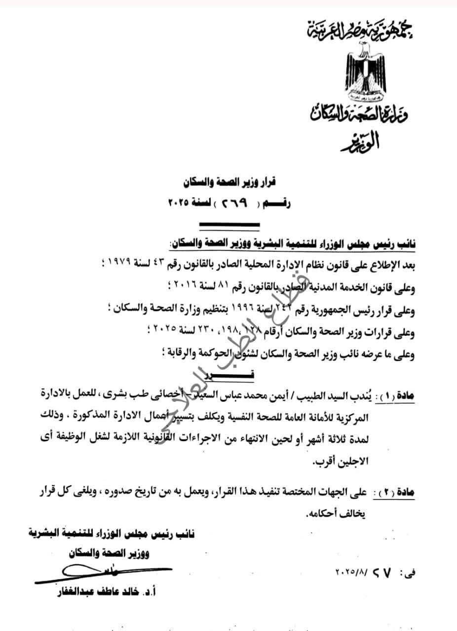 وعقب ذلك أصدر الدكتور خالد عبدالغفار وزير الصحة، قرار بنقل الدكتور أيمن عباس وتكليفه بتسيير أعمال الإدارة المركزية للأمانة العامة للصحة النفسية.