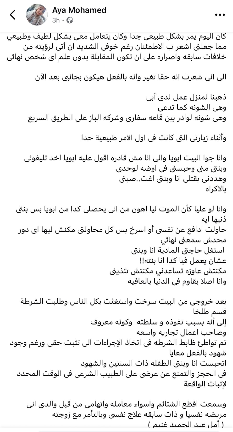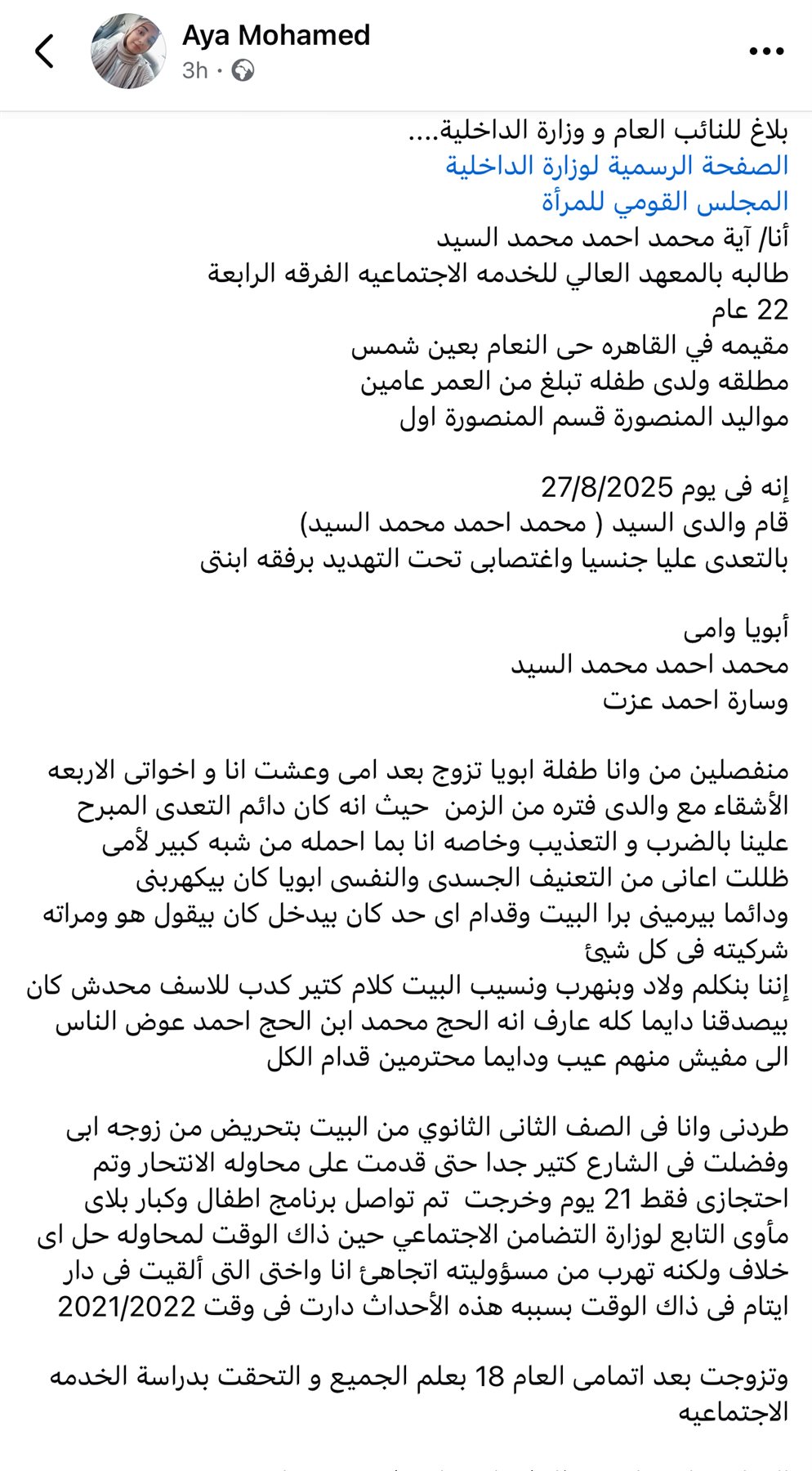 وتابعت،" إنه فى يوم 27/8/2025 قام والدى السيد ( محمد احمد محمد السيد) بالتعدى عليا جنسيا واغتصابى تحت التهديد برفقه ابنتى .. أبويا وامى محمد احمد محمد السيد وسارة احمد عزت منفصلين من وانا طفلة ابويا تزوج بعد امى وعشت انا و اخواتى الاربعه الأشقاء مع والدى فتره من الزمن حيث انه كان دائم التعدى المبرح علينا بالضرب و التعذيب وخاصه انا بما احمله من شبه كبير لأمى".