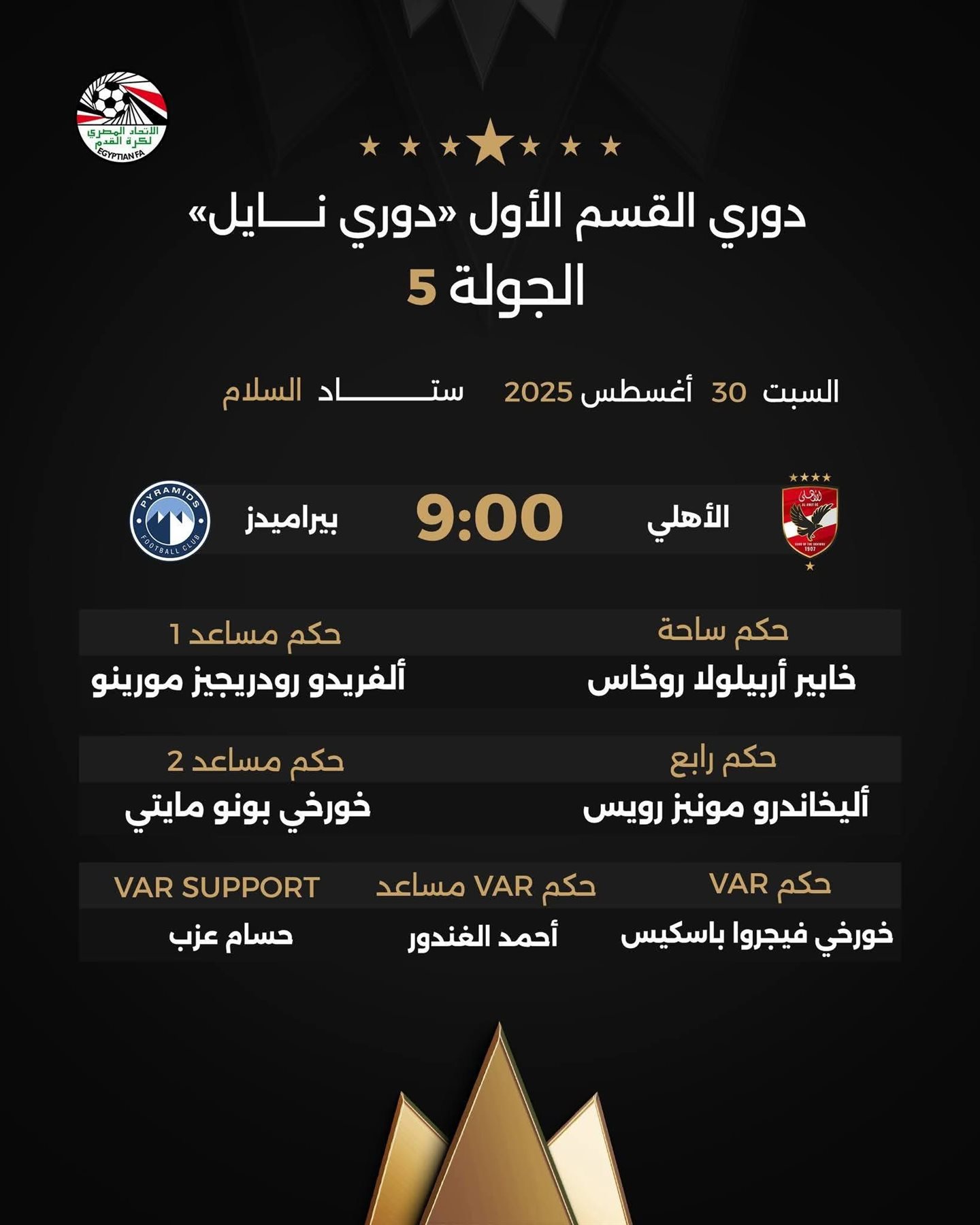 فيما أسندت مهمة الحكم الرابع إلى أحمد ناجي، بينما يشرف على تقنية الفيديو أحمد جابر حكمًا رئيسيًا، بمساعدة أحمد حسام طه.