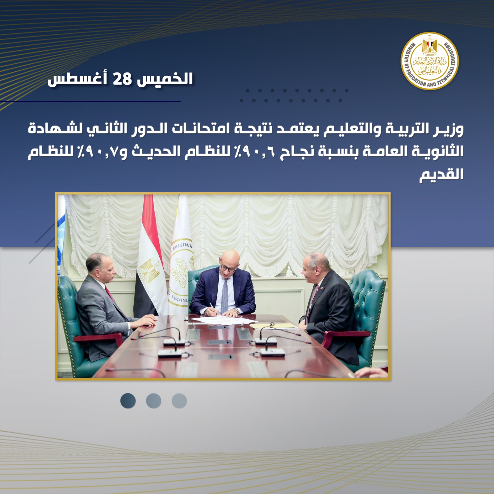 اعتمد محمد عبداللطيف، وزير التربية والتعليم والتعليم الفني، نتيجة امتحانات الدور الثاني لطلاب شهادة إتمام الثانوية العامة للعام الدراسي 2024 / 2025 بنسبة نجاح 90.6% للنظام الحديث و90.7% للنظام القديم.
