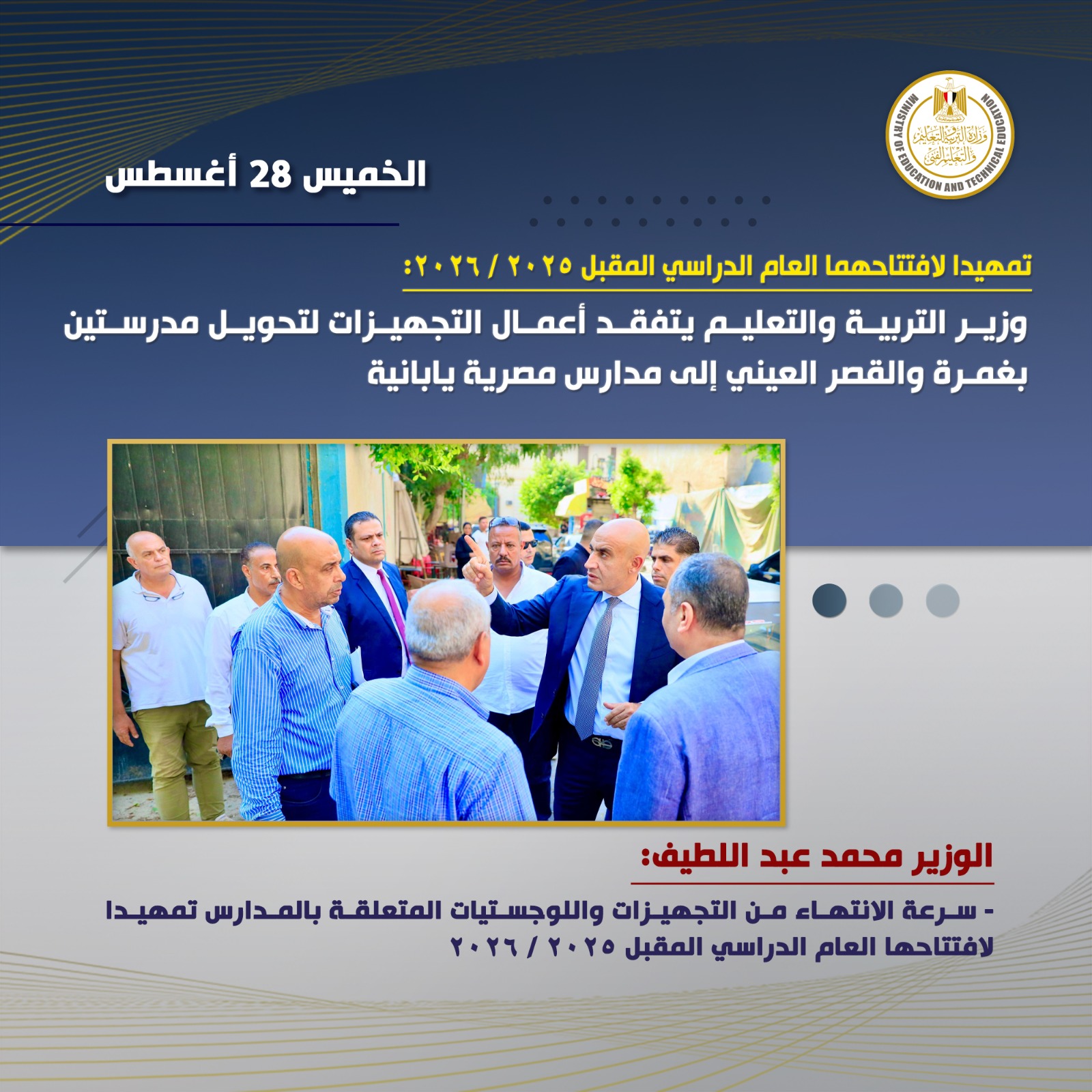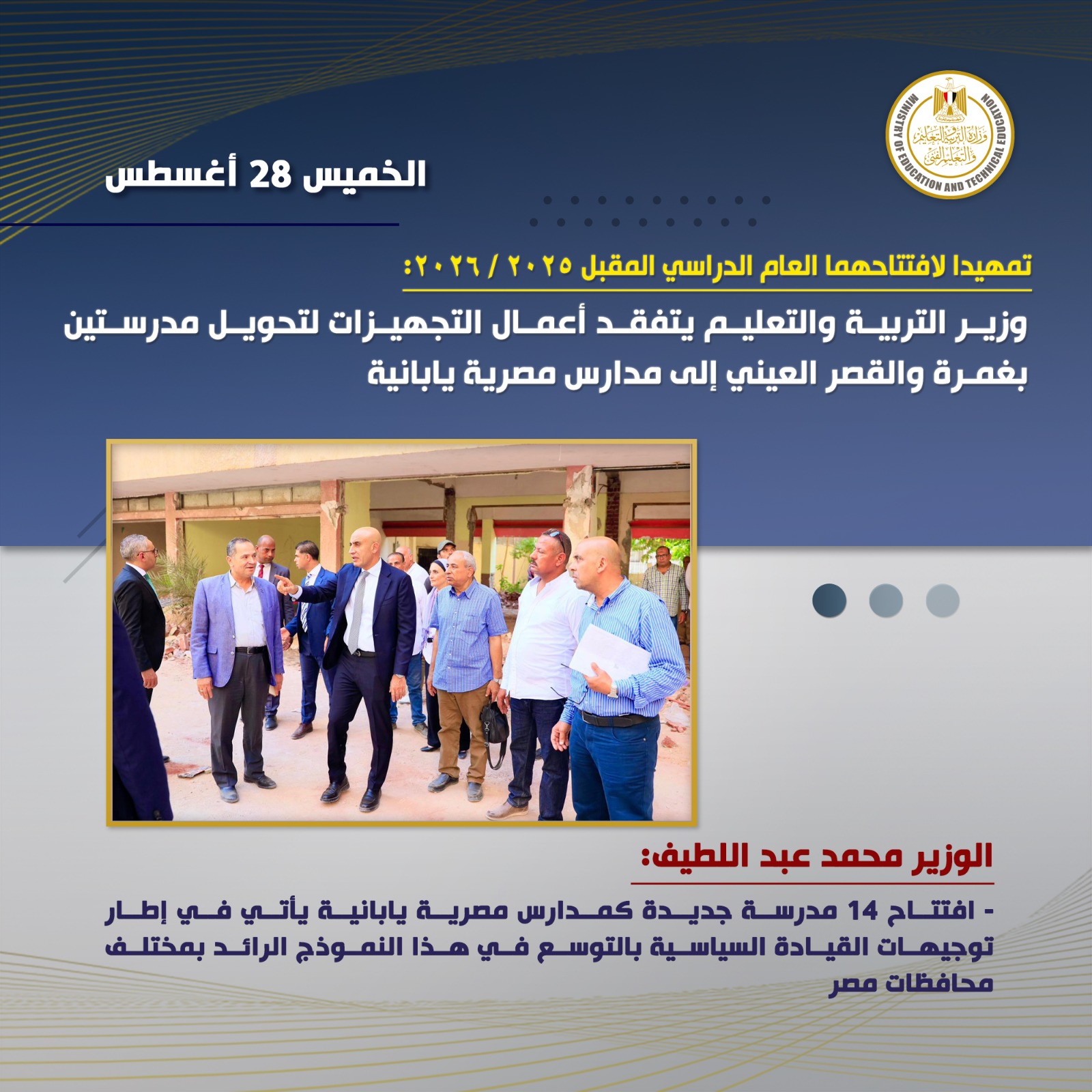 في إطار خطة وزارة التربية والتعليم والتعليم الفني للتوسع في المدارس المصرية اليابانية، تفقد محمد عبداللطيف وزير التربية والتعليم والتعليم الفني، مدرستين بمنطقتي غمرة والقصر العيني، للوقوف على آخر مستجدات التجهيزات الخاصة بتحويلهما إلى مدارس مصرية يابانية، تمهيدا لافتتاحهما العام الدراسي المقبل 2025/ 2026.