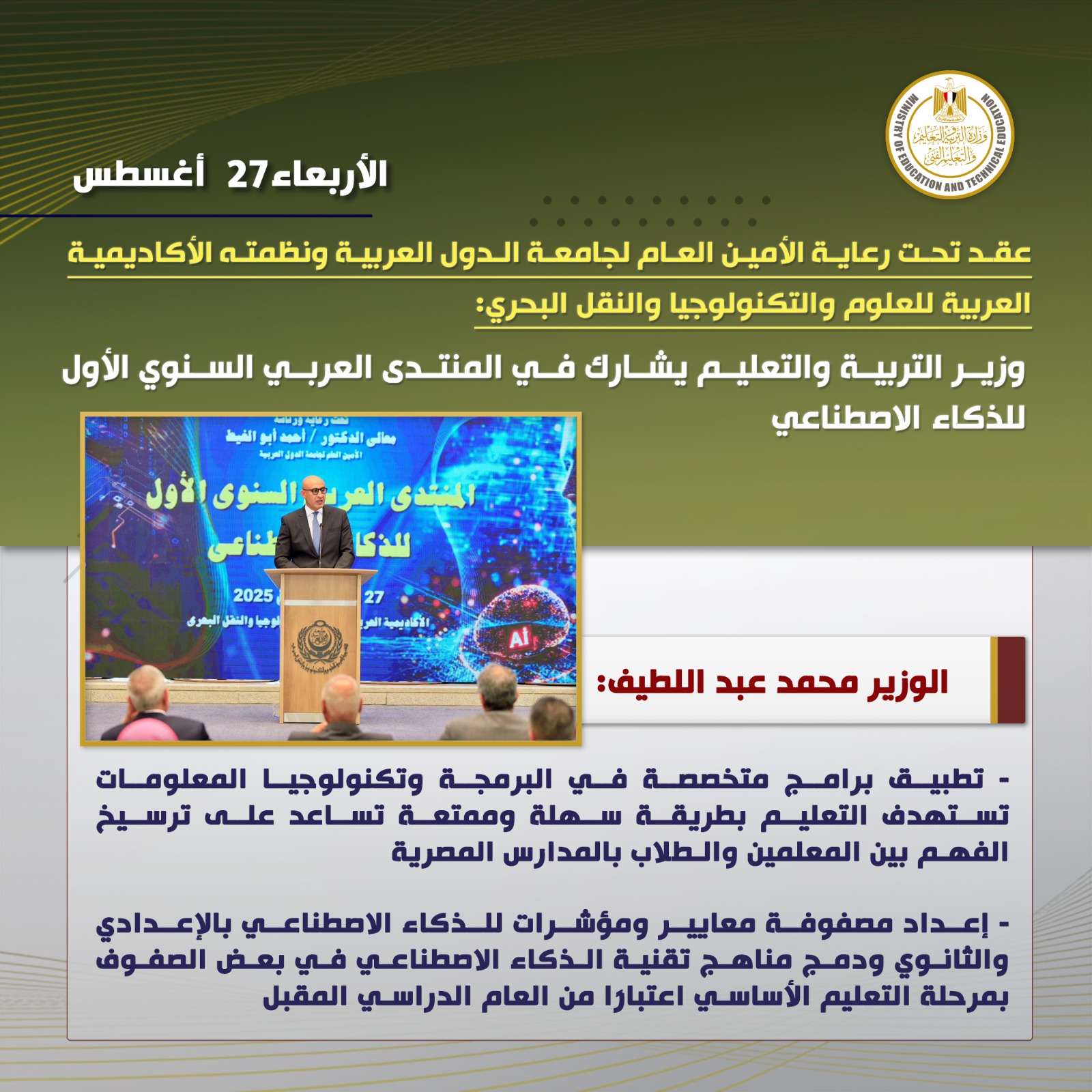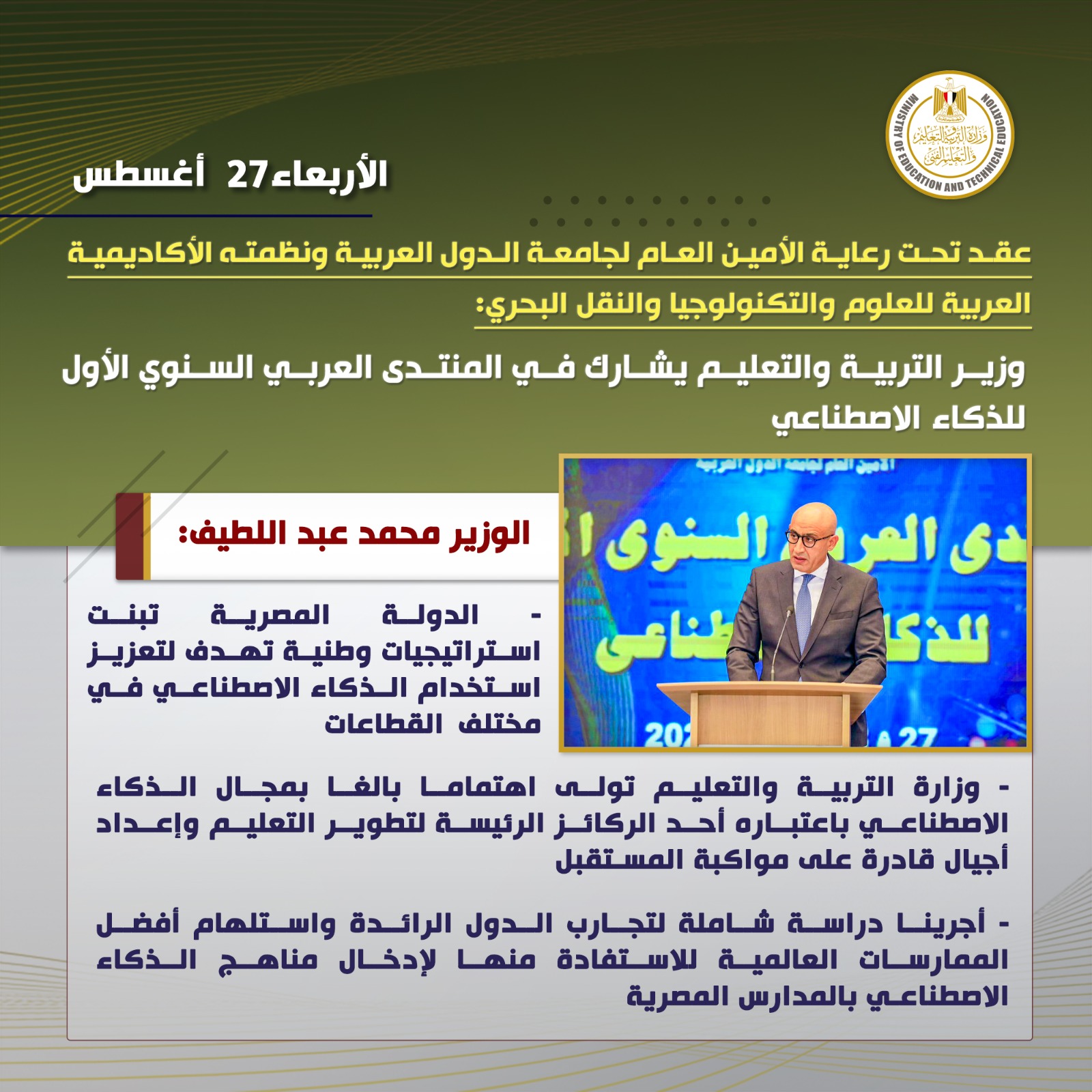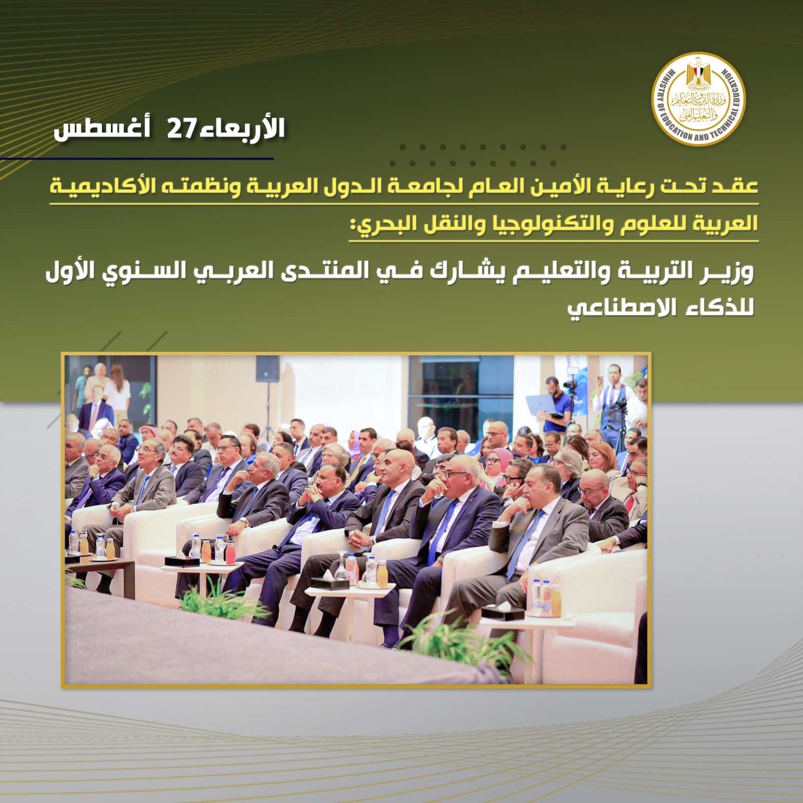 شارك محمد عبداللطيف وزير التربية والتعليم والتعليم الفني، في فعاليات المنتدى العربي السنوي الأول للذكاء الاصطناعي، والذي يعقد تحت رعاية وحضور الدكتور أحمد أبو الغيط الأمين العام لجامعة الدول العربية، وتنظمه الأكاديمية العربية للعلوم والتكنولوجيا والنقل البحري، بالتعاون مع الأمانة العامة لجامعة الدول العربية، وذلك خلال الفترة من 27 إلى 28 أغسطس بمدينة العلمين الجديدة.