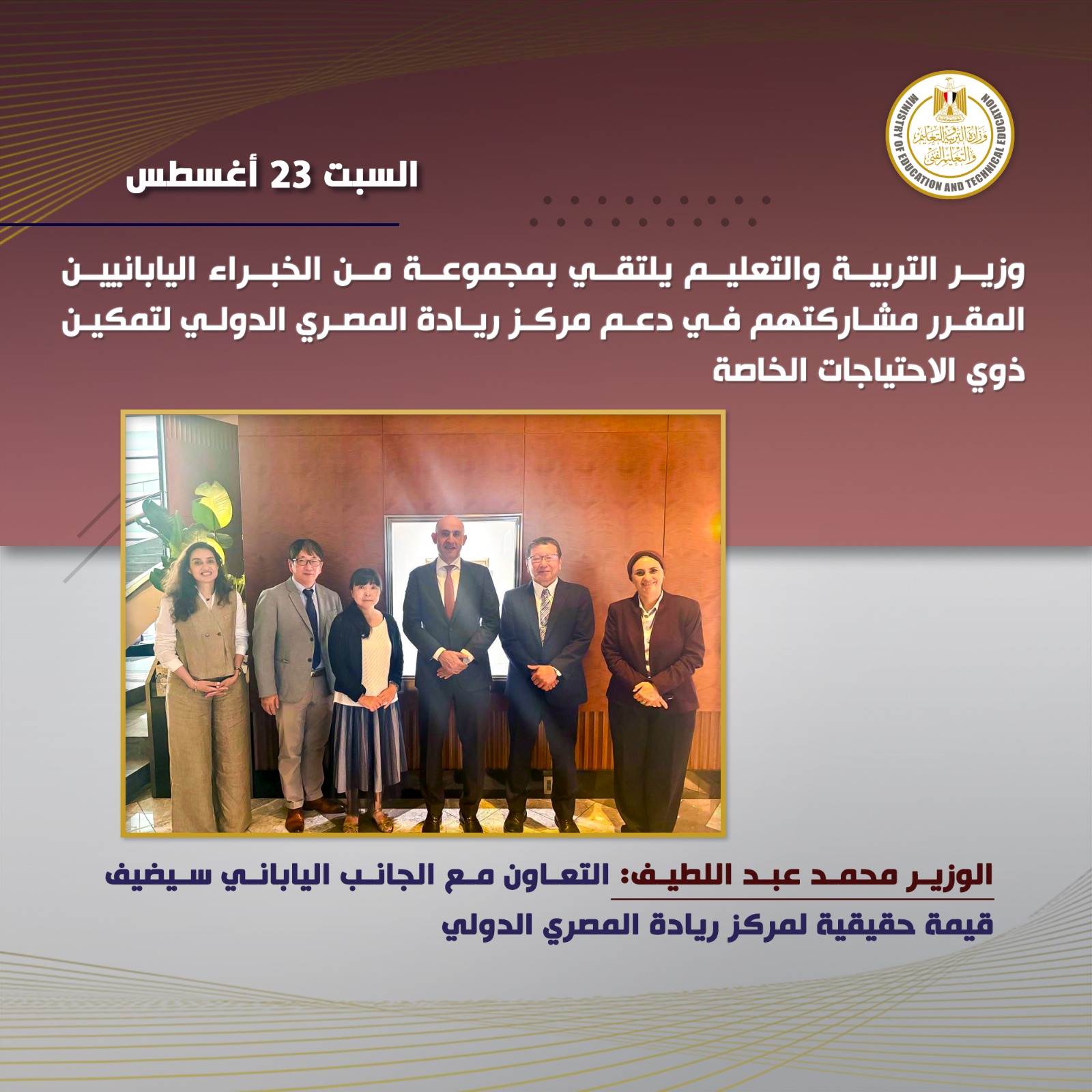 والتقى عبداللطيف وزير التربية والتعليم والتعليم الفنى مجموعة من الخبراء اليابانيين فى مجال ذوى الإعاقة المقرر إيفادهم لمصر؛ للتعاون في إدارة مركز ريادة المصري الدولي لدعم وتمكين ذوي الاحتياجات الخاصة بمدينة العاشر من رمضان، بما يساهم في تطوير منظومة التعليم الدامج وتحقيق مبدأ تكافؤ الفرص التعليمية، وذلك في إطار زيارته لليابان للمشاركة في فعاليات مؤتمر طوكيو للتنمية في أفريقيا " تيكاد 9".