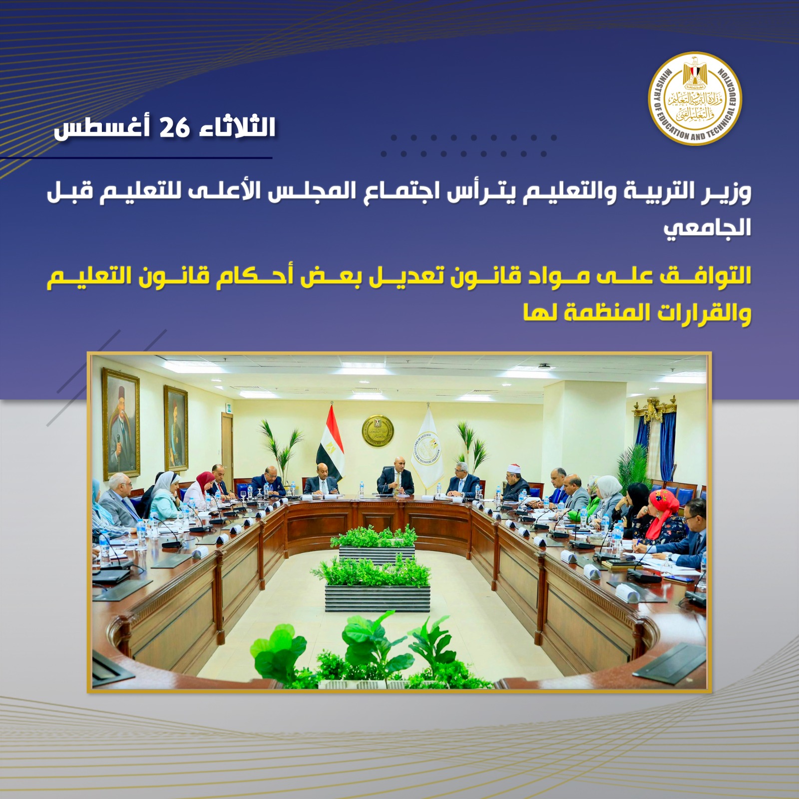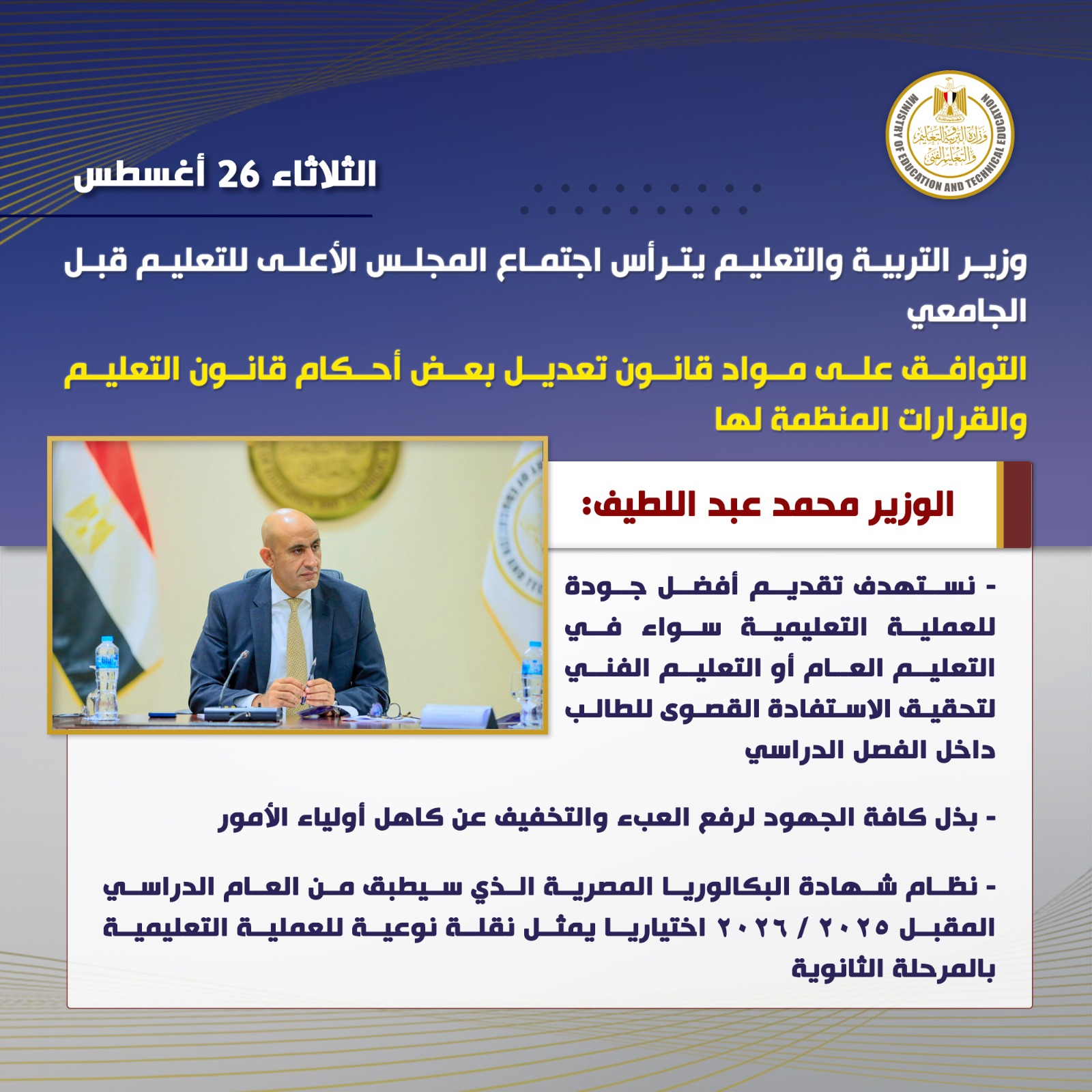 ترأس محمد عبداللطيف، وزير التربية والتعليم والتعليم الفني، اجتماع المجلس الأعلى للتعليم قبل الجامعي؛ لاستعراض مواد القانون رقم (169) لسنة 2025بتعديل بعض أحكام قانون التعليم، حيث شهد الاجتماع توافقا من أعضاء المجلس على مواد القانون والقرارات المنظمة.