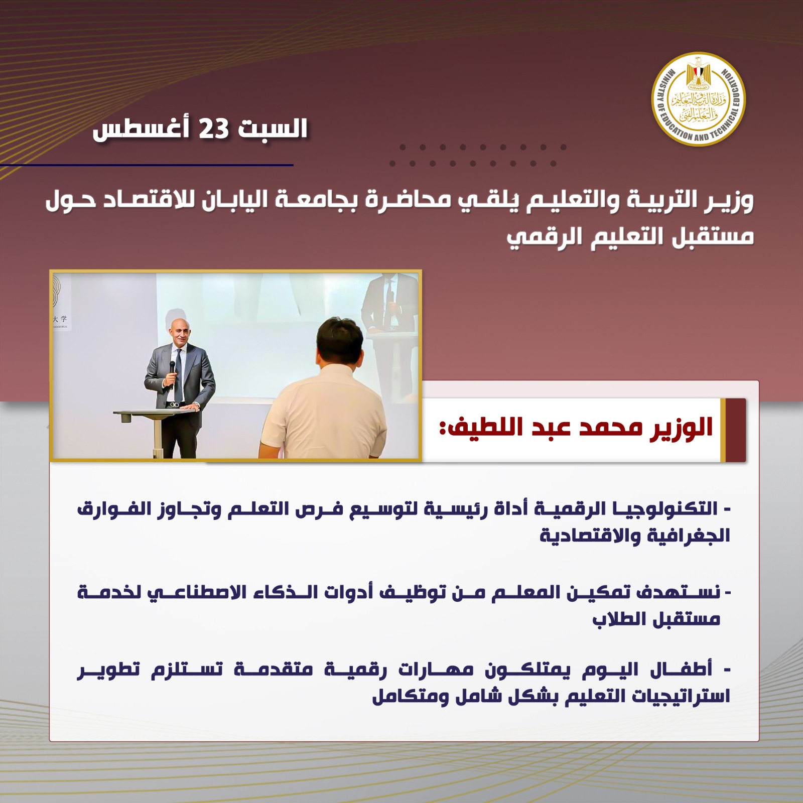 وألقى عبداللطيف وزير التربية والتعليم والتعليم الفنى، محاضرة بجامعة اليابان للاقتصاد "نيهون كيزاي"، بالعاصمة اليابانية طوكيو، حول مستقبل التعليم الرقمي، وذلك ضمن فعاليات "حلقة البحث في علوم البيانات في عصر التحول الرقمي (DX)".
