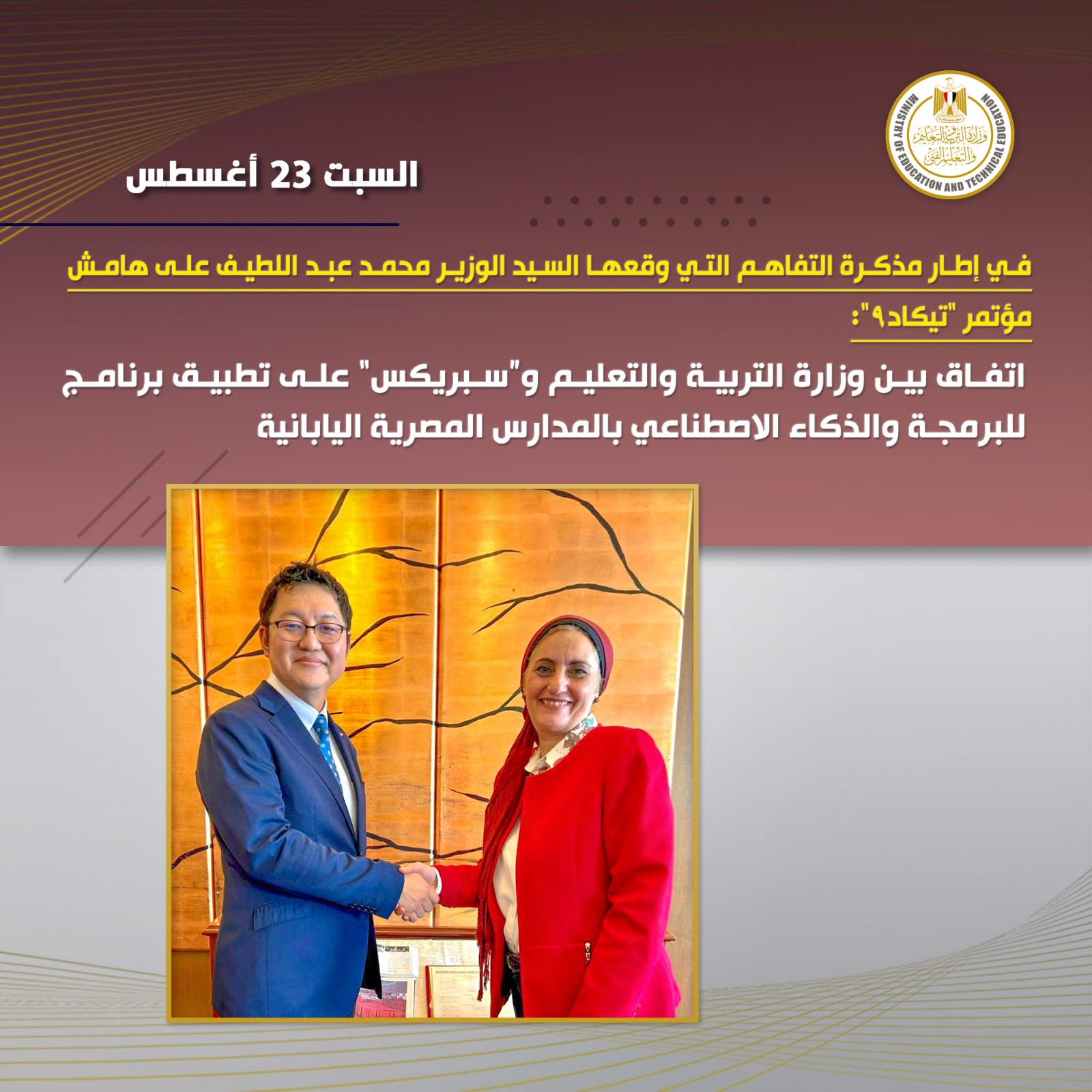 في إطار مذكرة التفاهم التي وقعها محمد عبداللطيف وزير التربية والتعليم والتعليم الفني مع شركة “سبريكس” اليابانية على هامش مؤتمر طوكيو الدولي للتنمية في أفريقيا "تيكاد 9”، اتفق الجانبان على تطبيق برنامج متخصص في تكنولوجيا المعلومات والاتصالات (ICT) والبرمجة لطلاب الصفين الرابع والخامس الابتدائي بالمدارس المصرية اليابانية.