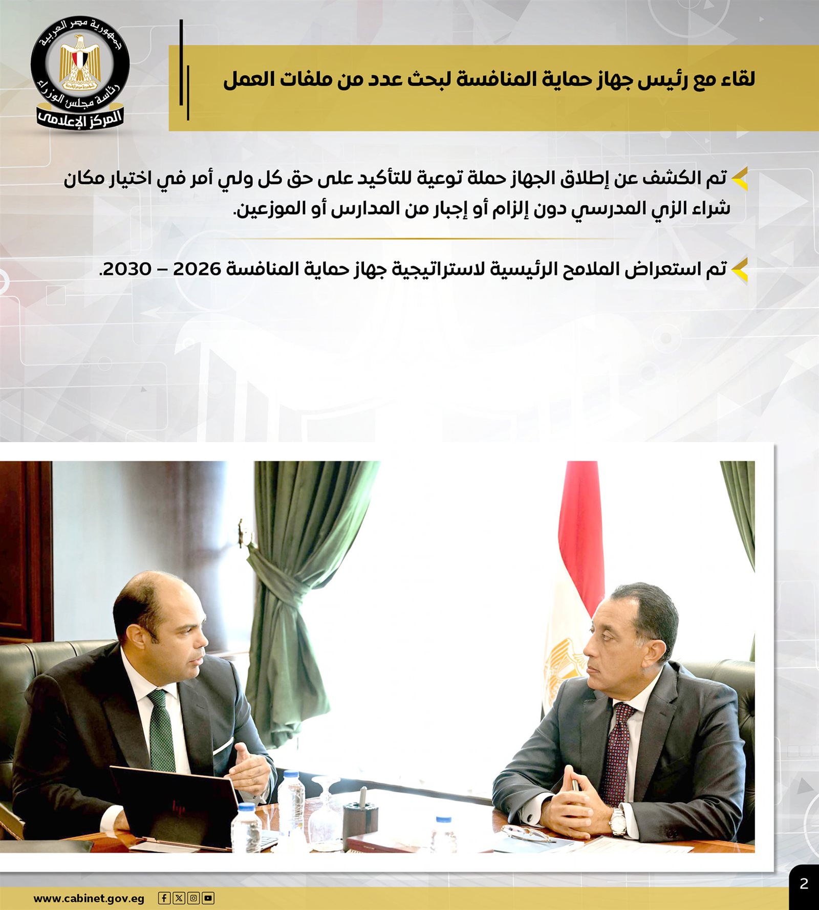 كما التقى سيادته مع رئيس جهاز حماية المنافسة، لبحث عدد من ملفات العمل، حيث تم الكشف عن إطلاق الجهاز حملة توعية للتأكيد على حق كل ولي أمر في اختيار مكان شراء الزي المدرسي دون إلزام أو إجبار من المدارس أو الموزعين، كما تم استعراض الملامح الرئيسية الاستراتيجية جهاز حماية المنافسة 2026 – 2030.
