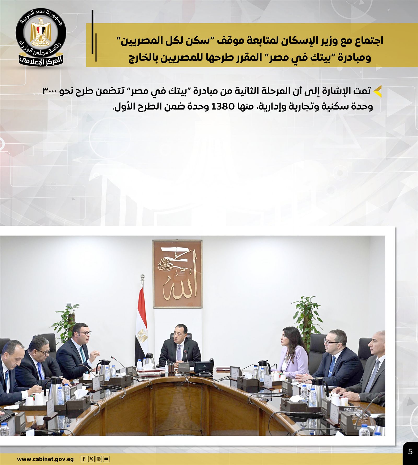 وعقد اجتماعًا مع وزير الإسكان لمتابعة موقف "سكن لكل المصريين" ومبادرة "بيتك في مصر" المقرر طرحها للمصريين بالخارج، وتمت الإشارة إلى أن المرحلة الثانية من مبادرة "بيتك في مصر" تتضمن طرح نحو ٣٠٠٠ وحدة سكنية وتجارية وإدارية، منها 1380 وحدة ضمن الطرح الأول.