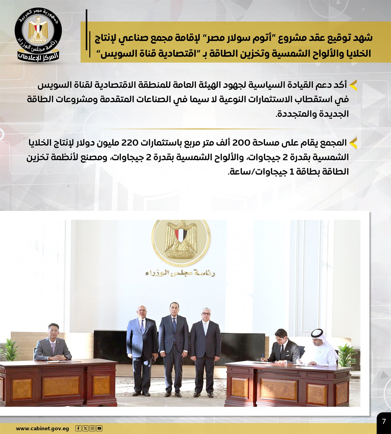 كما شهد الدكتور مصطفى مدبولي، توقيع عقد مشروع "أتوم سولار مصر" لإقامة مجمع صناعي لإنتاج الخلايا والألواح الشمسية وتخزين الطاقة بـ "اقتصادية قناة السويس"، وذلك على مساحة 200 ألف م٢، وباستثمارات 220 مليون دولار لإنتاج الخلايا الشمسية بقدرة 2 جيجاوات، والألواح الشمسية بقدرة 2 جيجاوات، ومصنع لأنظمة تخزين الطاقة بطاقة 1 جيجاوات/ساعة.