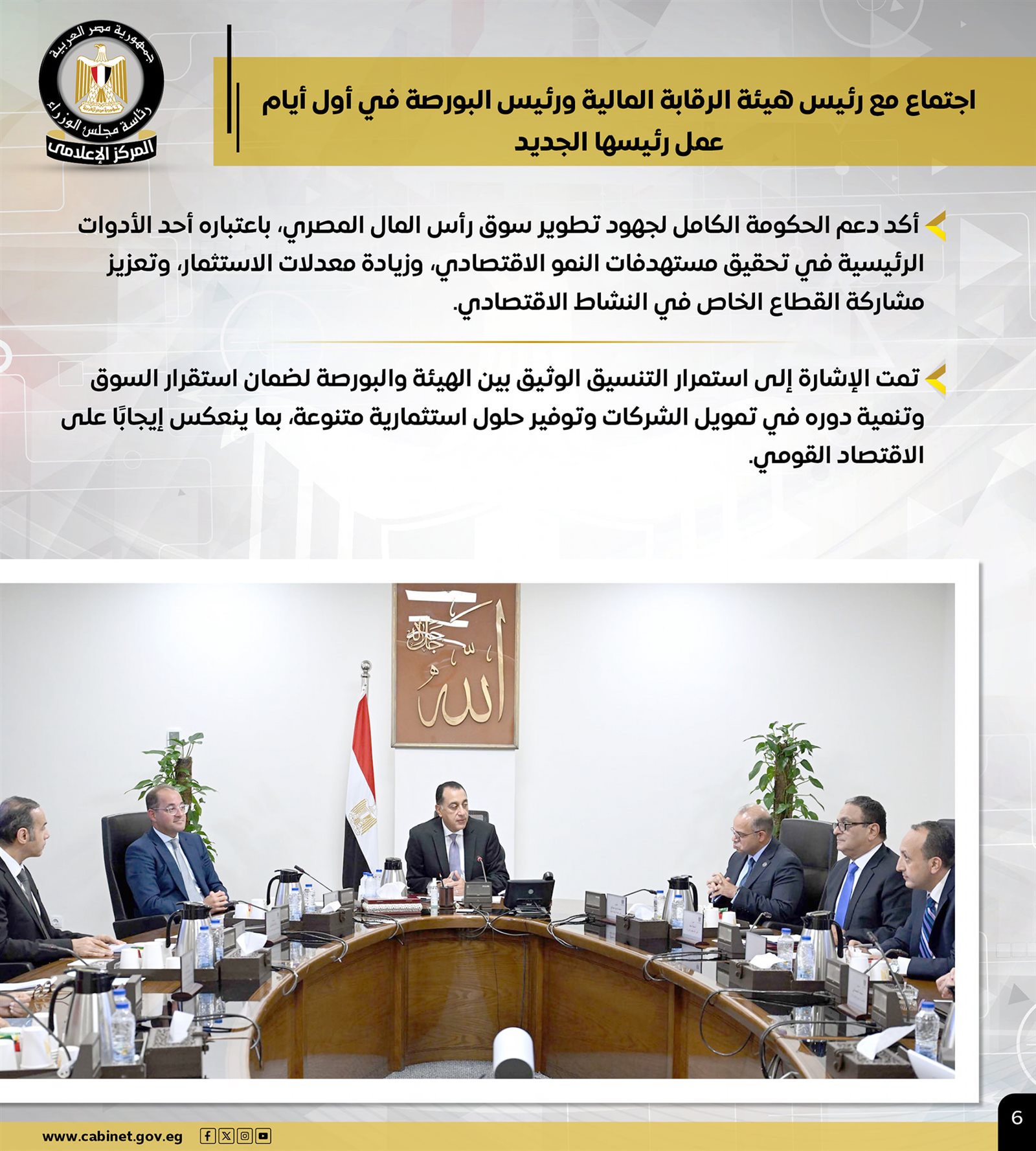 وتضمنت أنشطة رئيس الوزراء، اجتماعًا مع رئيس هيئة الرقابة المالية، ورئيس البورصة في أول أيام عمل رئيسها الجديد، مؤكدًا دعم الحكومة الكامل لجهود تطوير سوق رأس المال المصري، وتمت الإشارة إلى استمرار التنسيق الوثيق بين الهيئة والبورصة لضمان استقرار السوق وتنمية دوره في تمويل الشركات وتوفير حلول استثمارية متنوعة، بما ينعكس إيجابًا على الاقتصاد القومي.