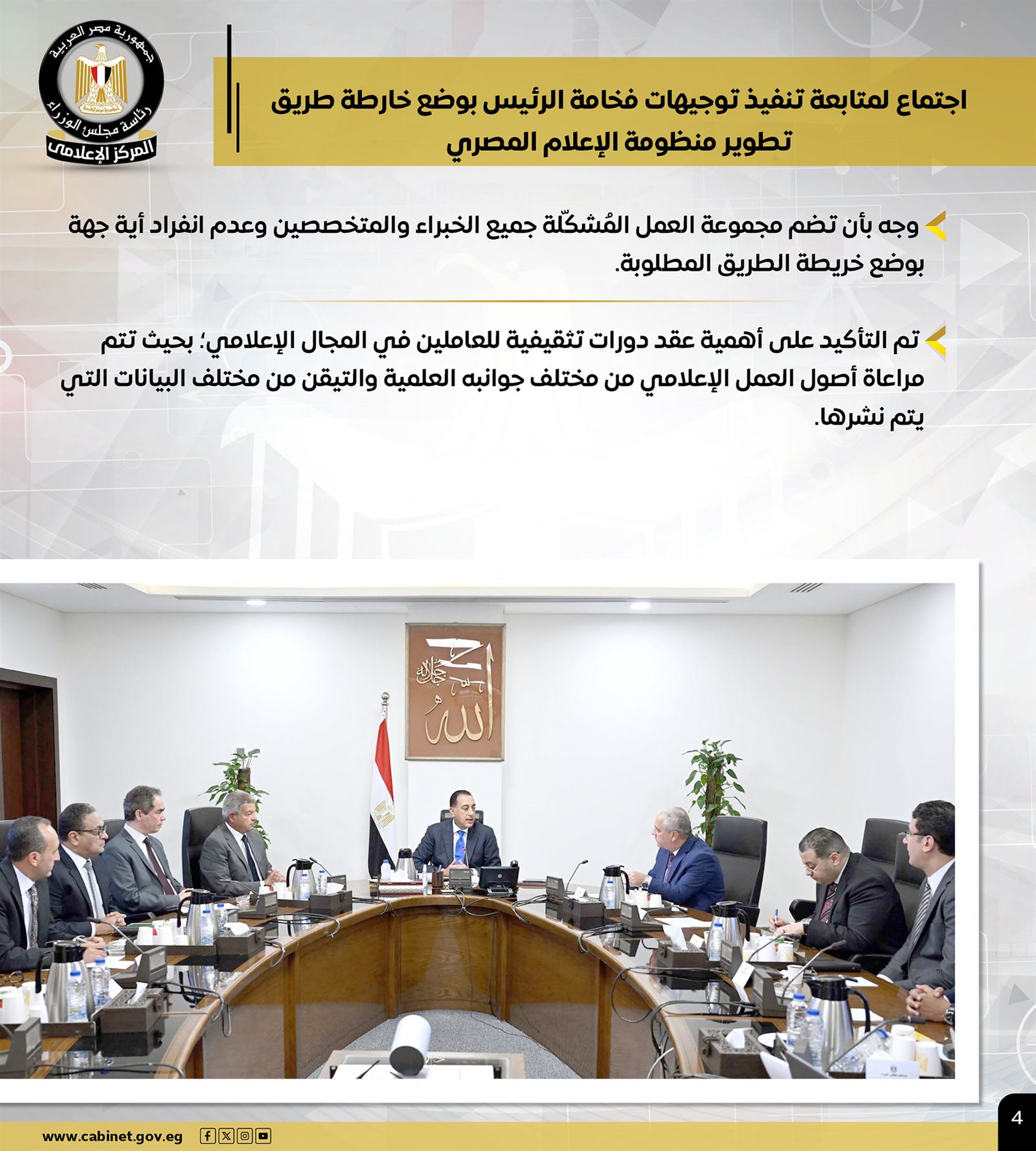 كما عقد اجتماعًا لمتابعة تنفيذ التوجيهات الرئاسية بوضع خارطة طريق تطوير منظومة الإعلام المصري، موجهًا بأن تضم مجموعة العمل المُشكّلة جميع الخبراء والمتخصصين، وعدم انفراد أية جهة بوضع هذه الخارطة، مؤكدًا أهمية عقد دورات تثقيفية للعاملين في المجال الإعلامي.