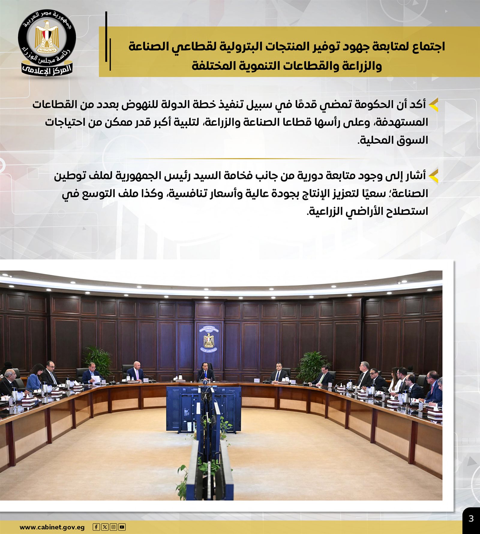 وشملت الأنشطة، اجتماع رئيس مجلس الوزراء لمتابعة جهود توفير المنتجات البترولية لقطاعي الصناعة والزراعة والقطاعات التنموية المختلفة، مشيرًا إلى وجود متابعة دورية من جانب فخامة السيد الرئيس لملف توطين الصناعة؛ سعيًا لتعزيز الإنتاج بجودة عالية وأسعار تنافسية، وكذا ملف التوسع في استصلاح الأراضي الزراعية.