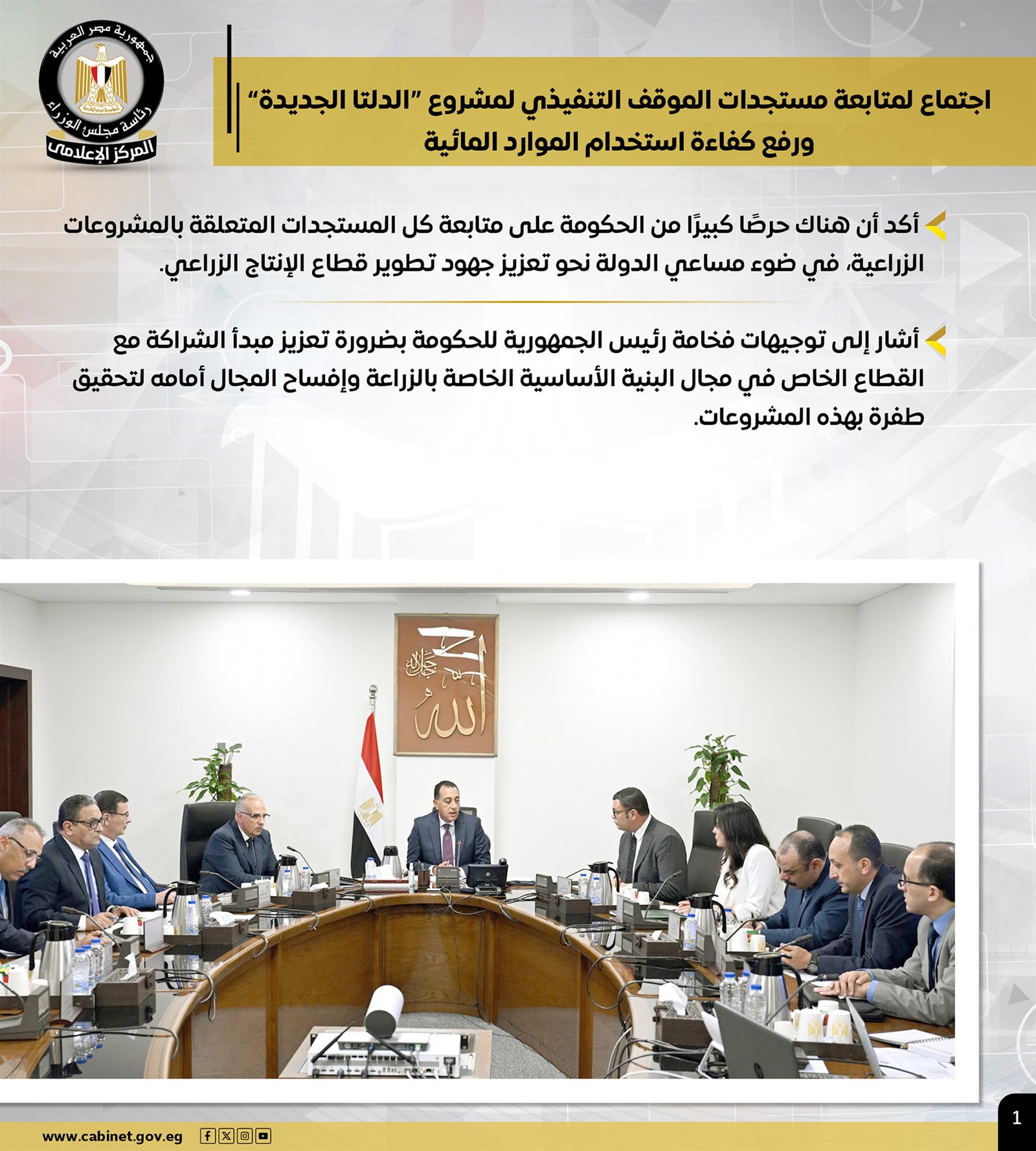 وتضمنت الأنشطة، اجتماع رئيس الوزراء، لمتابعة مستجدات الموقف التنفيذي لمشروع "الدلتا الجديدة" ورفع كفاءة استخدام الموارد المائية، حيث أشار سيادته إلى أن هناك توجيهات رئاسية بضرورة تعزيز مبدأ الشراكة مع القطاع الخاص في مجال البنية الأساسية الخاص بالزراعة، وإفساح المجال أمامه لتحقيق طفرة بهذه المشروعات.