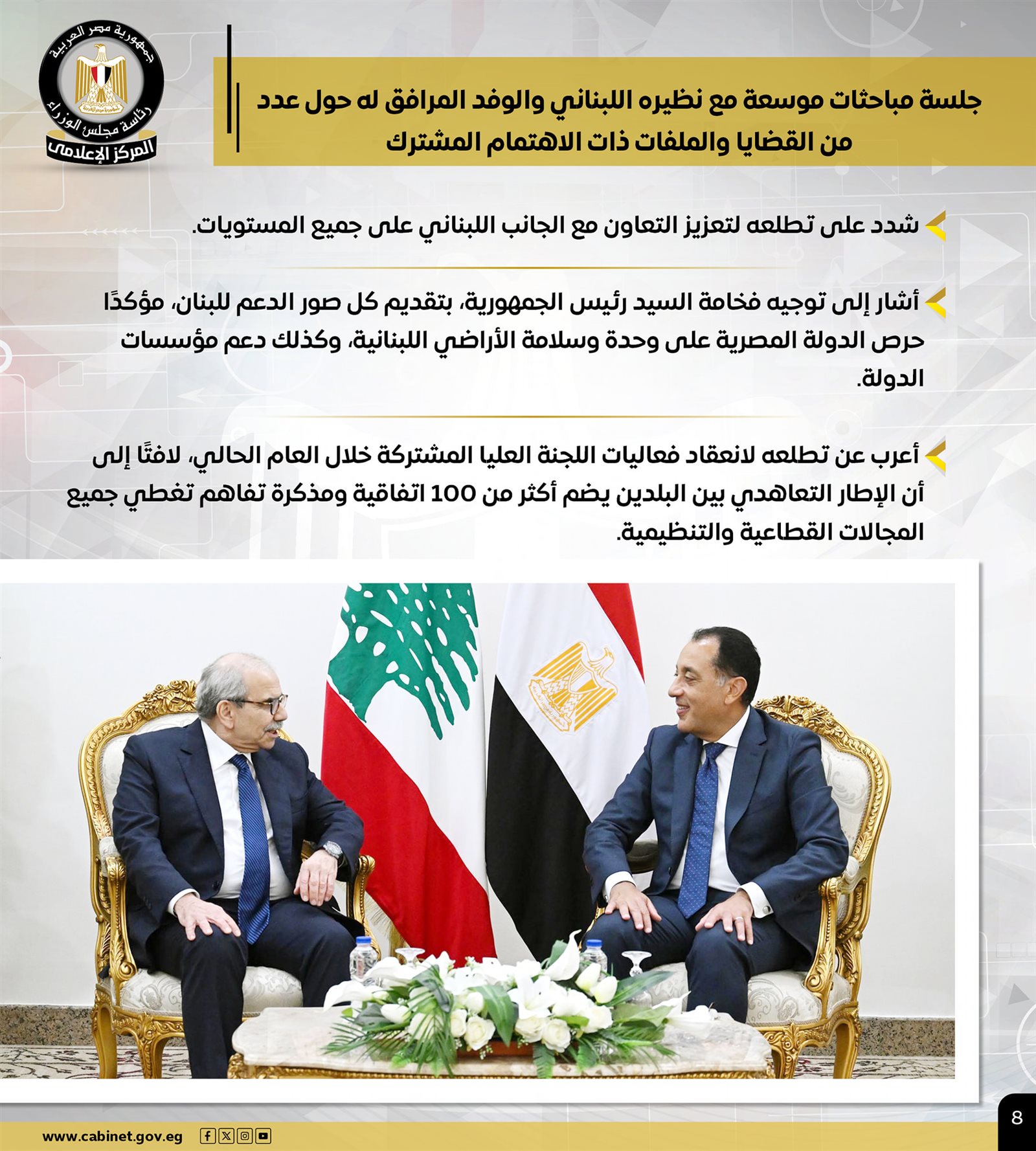 وعقد رئيس الوزراء جلسة مباحثات موسعة مع نظيره اللبناني والوفد المرافق له حول عدد من القضايا والملفات ذات الاهتمام المشترك، مشيرًا إلى توجيه فخامة الرئيس عبد الفتاح السيسي بتقديم كل صور الدعم للبنان، معربًا عن تطلعه لانعقاد فعاليات اللجنة العليا المشتركة خلال العام الحالي.