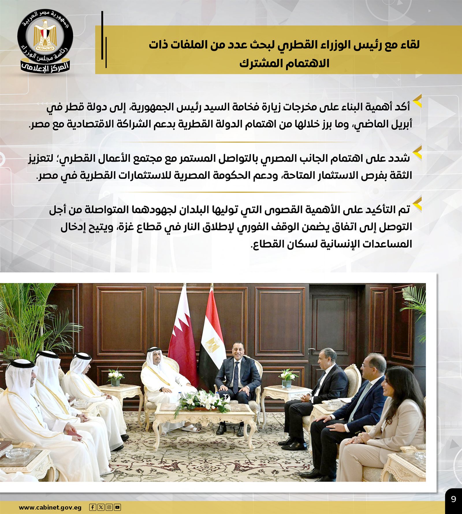كما التقى مع رئيس الوزراء القطري، لبحث عدد من الملفات ذات الاهتمام المشترك، مؤكدًا أهمية البناء على مخرجات زيارة فخامة الرئيس إلى قطر في أبريل الماضي، وما برز خلالها من اهتمام الدولة القطرية بدعم الشراكة الاقتصادية مع مصر، فيما شدد سيادته على اهتمام الجانب المصري بالتواصل المستمر مع مجتمع الأعمال القطري، ودعم الحكومة المصرية للاستثمارات القطرية في مصر.