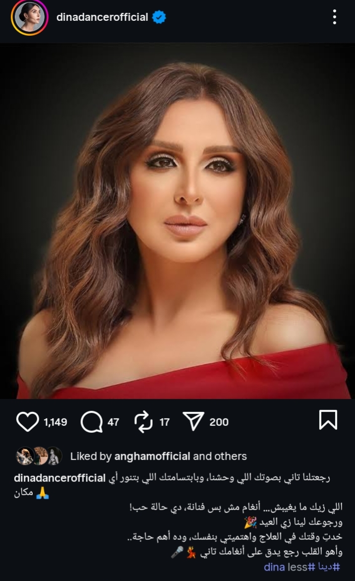 ونشرت دينا صورة لـ انغام من خلال حسابها الرسمي عبر موقع تبادل الصور والفيديوهات القصيرة "إنستجرام"، ووجهت له رسالة، وقالت:" رجعتلنا تاني بصوتك اللي واحشنا، وبابتسامتك اللي بتنور أي مكان".