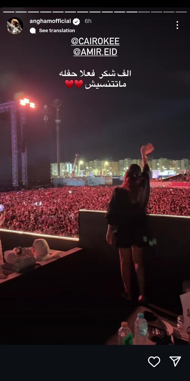 وبعد ظهورها وجهت أنغام رسالة شكر لـ جمهورها الذين احتفلوا بها، ونشرت فيديو أثناء وجودها في الحفل، وذلك من خلال حسابها الرسمي عبر موقع تبادل الصور والفيديوهات القصيرة "إنستجرام"، عبر خاصية ستوري، وكتبت: "ألف شكر.. فعلًا حفلة ماتتنسيش".