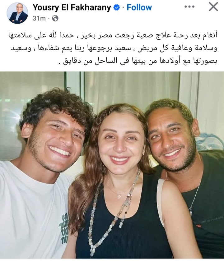 وكتب الفخراني عبر صفحته الرسمية "فيس بوك" أنغام بعد رحلة علاج صعبة رجعت مصر بخير ، حمدا لله على سلامتها وسلامة وعافية كل مريض ، سعيد برجوعها ربنا يتم شفاءها ، وسعيد بصورتها مع أولادها من بيتها فى الساحل من دقايق ".