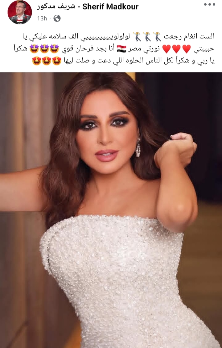 ونشر شريف مدكور صورة لـ أنغام من خلال حسابه الرسمي عبر موقع التواصل الاجتماعي "فيسبوك"، وكتب:"الست أنغام رجعت لولولي الف سلامة عليكي يا حبيبتي نورتي مصر أنا بجد فرحان أوي.. شكرًا ياربي وشكرًا لكل الناس الحلوة اللي دعت وصلت ليها".