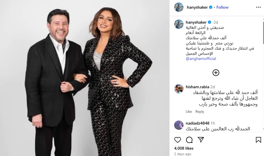 وجه الفنان الكبير هاني شاكر رسالة مؤثرة وخاصة للمطربة أنغام، وكتب شاكر عبر حسابه الرسمي "إنستجرام"" صديقتي وأختي الغالية ،الرائعة أنغام ألف حمدلله علي سلامتك نورتي مصر وطمنتينا عليكي في انتظار جديدك و فنك المحترم يا صاحبة الاحساس الجميل".