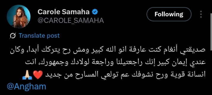 احتفلت الفنانة كارول سماحة بعودة صديقتها أنغام إلى مصر، وكتبت كارول سماحة منشور من خلال حسابها الرسمي عبر موقع التواصل الاجتماعي إكس، وقالت: "صديقتي أنغام كنت عارفه انو الله كبير ومش رح يتركك أبدًا، وكان عندي إيمان كبير إنك راجعتيلنا وراجعة لولادك وجمهورك، انت انسانة قوية ورح نشوفك عم تولعي المسارح من جديد".