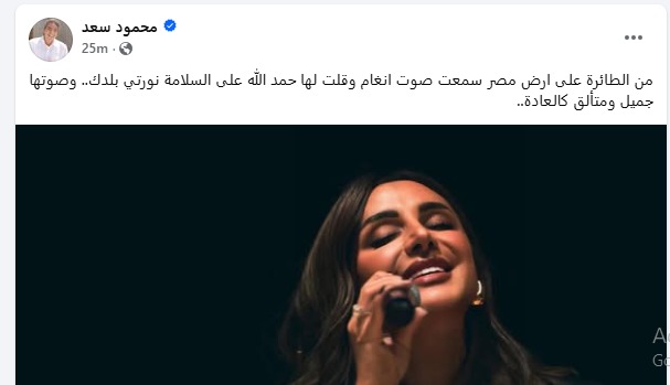 وكتب سعد عبر صفحته على فيسبوك: "من الطائرة على أرض مصر سمعت صوت أنغام وقلت لها: حمدًا لله على السلامة، نورتي بلدك.. وصوتها جميل ومتألق كالعادة".