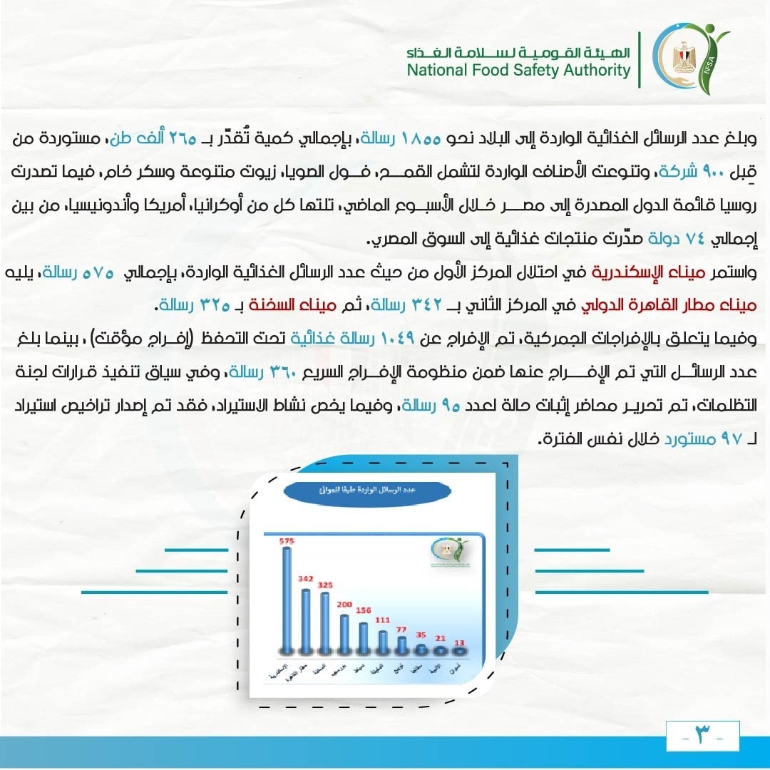 واستمر ميناء الإسكندرية في احتلال المركز الأول من حيث عدد الرسائل الغذائية الواردة، بإجمالي 575 رسالة، يليه ميناء مطار القاهرة الدولي في المركز الثاني بـــ 342 رسالة، ثم ميناء السخنة بـ 325 رسالة.