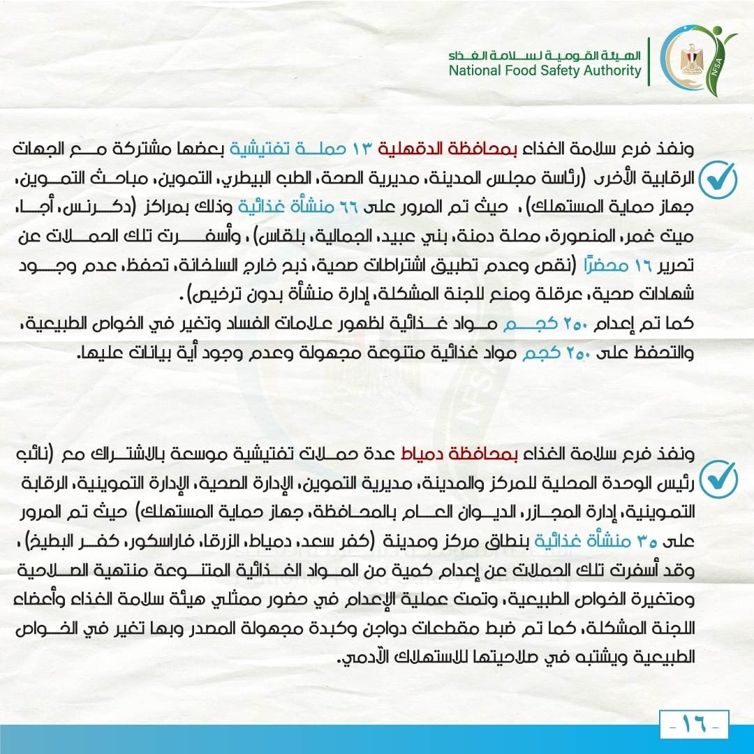 ونفذ فرع سلامة الغذاء بمحافظة الدقهلية 13 حملة تفتيشية بعضها مشتركة مع الجهات الرقابية الأخرى (رئاسة مجلس المدينة، مديرية الصحة، الطب البيطري، التموين، مباحث التموين، جهاز حماية المستهلك)، حيث تم المرور على 66 منشأة غذائية وذلك بمراكز (دكرنس، أجا، ميت غمر، المنصورة، محلة دمنة، بني عبيد، الجمالية، بلقاس)، وأسفرت تلك الحملات عن تحرير 16 محضرًا (نقص وعدم تطبيق اشتراطات صحية، ذبح خارج السلخانة، تحفظ، عدم وجود شهادات صحية، عرقلة ومنع للجنة المشكلة، إدارة منشأة بدون ترخيص).
