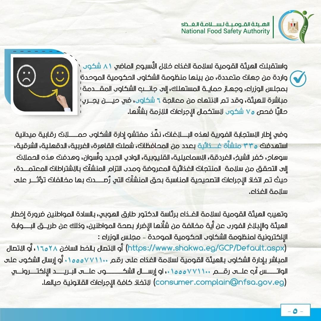 واستقبلت الهيئة القومية لسلامة الغذاء خلال الأسبوع الماضي 81 شكوى واردة من جهات متعددة، من بينها منظومة الشكاوى الحكومية الموحدة بمجلس الوزراء، وجهاز حماية المستهلك، إلى جانب الشكاوى المقدمة مباشرة للهيئة، وقد تم الانتهاء من معالجة 6 شكاوى، في حين يجري حاليًا فحص 75 شكوى لاستكمال الإجراءات اللازمة بشأنها.