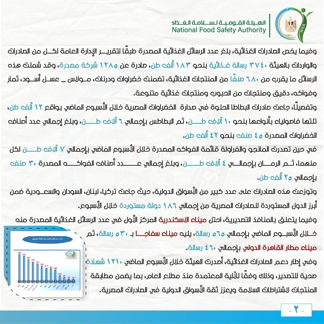 وفيما يخص الصادرات الغذائية، بلغ عدد الرسائل الغذائية المصدرة طبقًا لتقرير الإدارة العامة لكل من الصادرات والواردات بالهيئة 3740 رسالة غذائية بنحو 183 ألف طن، صادرة عن 1285 شركة مصدرة، وقد شملت هذه الرسائل ما يقرب من 680 صنفًا من المنتجات الغذائية، تضمنت خضراوات ودرنات، مولاس _ عسل أسود، ثمار وفواكه، دقيق ومنتجات من الحبوب ومنتجات غذائية متنوعة.