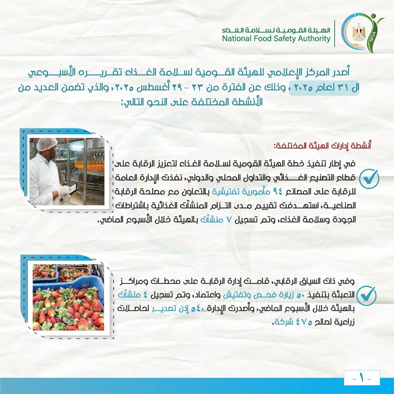أصدر المركز الإعلامي للهيئة القومية لسلامة الغذاء تقريره الأسبوعي الـ 31 لعام 2025، وذلك عن الفترة من 23 – 29 أغسطس، والذي تضمن العديد من الأنشطة المختلفة على النحو التالي:
