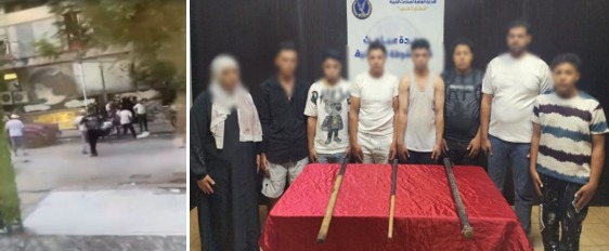 أمكن تحديد وضبط مرتكبى الواقعة (7 أشخاص وإحدى السيدات - مقيمين بدائرة قسم شرطة الطالبية بالجيزة) وبحوزتهم (3 عصى خشبية).