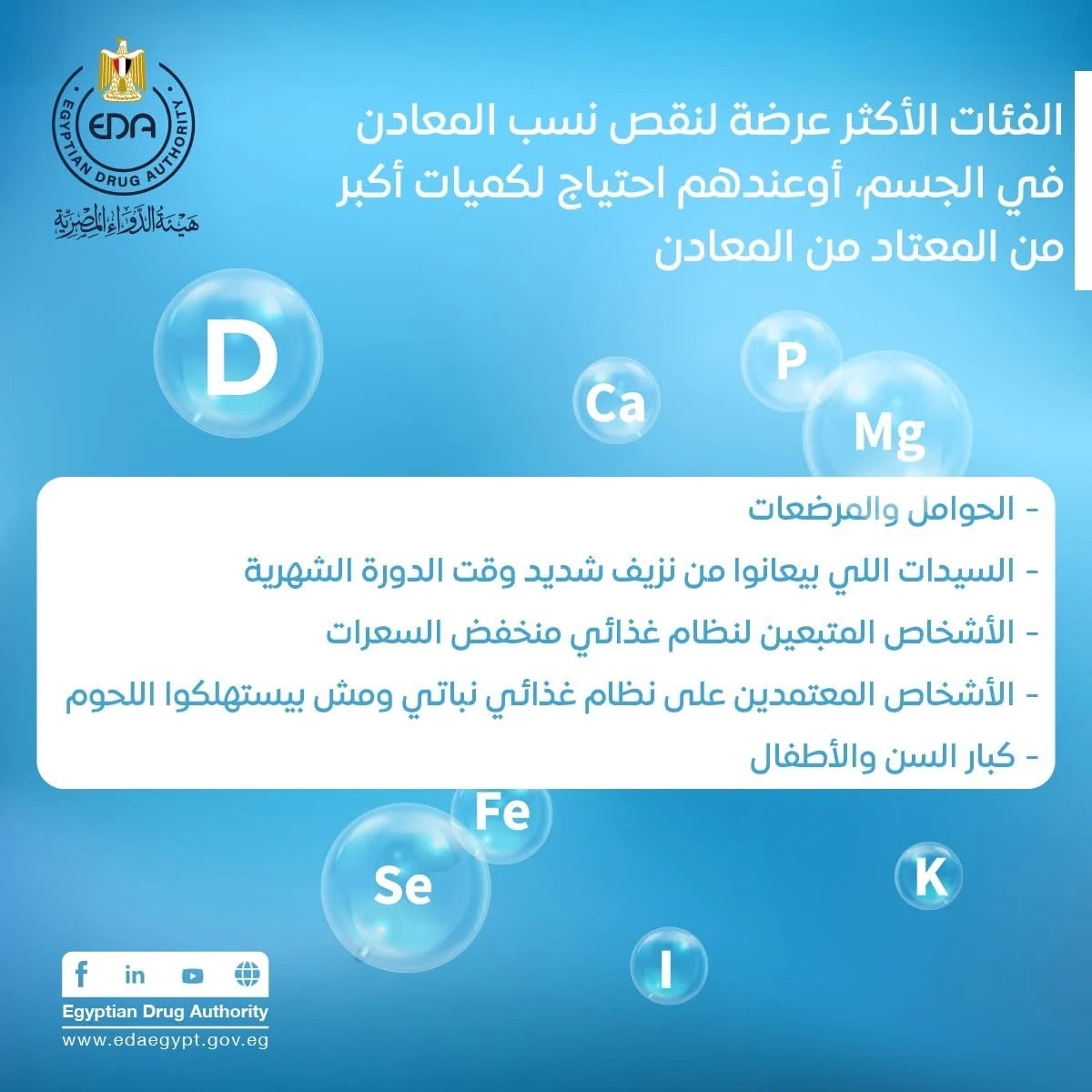 كشفت هيئة الدواء المصرية عن الفئات الأكثر عرضة لنقص نسب المعادن في الجسم، أو لديهم احتياج لكميات أكبر من المعتاد من المعادن وهم : -